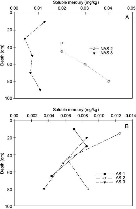 The soluble Hg concentrations among the soil sample sites were not high enough to detect significant differences (ANOVA, 95 % CI). Nonetheless, as shown in figure 5A, the soluble Hg concentrations in the NAS-2 soils were notably higher than those in the soils from the other sample sites and increased with depth from 0.02 to 0.04 mg/kg. Therefore the low solubility of Hg in the mining waste and soil samples under simulated rainwater contact conditions indicated that aqueous transport was a minor contributor to the vertical migration governed by soluble chemical Hg species. Thus, colloidal transport could play a major role in the downward migration of Hg in soils (Navarro 2008).