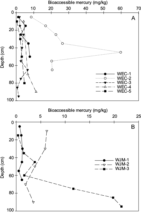 Regarding the variations in the bioaccessible Hg concentrations with mining waste depth in the WEC-2 sample area, an important peak in the Hg concentration was observed, with concentrations of 26 mg/kg at 40-50 cm to 60 mg/kg at 50-60 cm, which coincided with the higher total and soluble Hg concentrations at the same sample site and in WJM-3 sample site. A notable increase in the concentration of bioaccessible Hg occurred with the bioaccessible Hg concentration reaching 22 mg/kg in the deepest sampled section (90-100 cm). Thus, the vertical distributions of bioaccessible Hg at the WEC-2 and WJM-3 mining waste sample sites were primarily controlled by the total Hg concentration. The shapes of the total, soluble and bioaccessible Hg profiles were similar for this sample area, which indicated a homogenous distribution of chemical Hg species throughout the sampled mining waste profile.