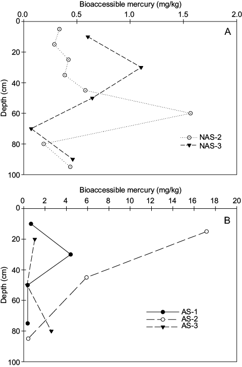 The bioaccessible Hg concentrations in soils ranged from 0.1 to 17 mg/kg and were notably different among the sample areas (Fig. 7). The samples from the NAS-2, NAS-3 and AS-3 areas had lower bioaccessible Hg concentrations of 0.1 to 3 mg/kg that varied slightly with depth. By contrast, site AS-1 had a significant peak of the bioaccessible Hg concentration of up to 4 mg/kg at a depth of 20-40 cm, and the AS-2 sample area had a distinctive bioaccessible Hg concentration profile that clearly decreased from 17 mg/kg at the surface to 0.4 mg/kg in the deeper sections. Similar patterns in the total (Fig. 3) and bioaccessible Hg (Fig. 7) concentrations were observed at the AS-1 and AS-2 sample sites, which indicated that the bioaccessibility of Hg were homogenous throughout the studied soil profiles.