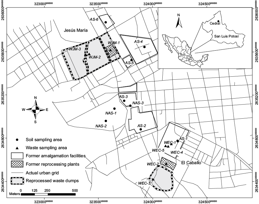 Seventeen sample areas were selected based on the locations of former amalgamation facilities according to historical maps from Cedral (Aguirre 1878, Hornelas 1905) and on the locations of abandoned leaching plants and reprocessed mining wastes dumps. Eight areas were selected for soils sampling (Table I), including three near former amalgamation facilities to represent soils that were affected indirectly by the amalgamation process (NAS-1 to NAS-3), and six inside former amalgamation facilities to represent soils that were affected directly by amalgamation (AS-1 to AS-6). In addition, five areas were selected at the mining wastes dumps at El Caballo (WEC-1 to WEC-5), and three at the Jesús María (WJM-1 to WJM-3) reprocessing site (Table II). Additionally, one area with low anthropogenic influence was used as a reference site. In figure 1, the locations of the sample areas are shown, except the reference sample area, which was located approximately 1.5 km southeast from the El Caballo site.