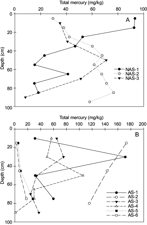 The Hg concentration profiles in the soil cores are presented in figure 3, and distinctive shapes and pronounced Hg concentration peaks are shown for sites NAS-3 (40-60 cm soil section), AS-1 (20-40 cm soil section) and AS-4 (40-60 cm soil section). The Hg concentrations varied less with depth at the other sampling sites. However, it was observed that the Hg concentrations slightly increased (NAS-2, AS-5 and AS-6) or decreased (NAS-1, NAS-3, AS-2 and AS-3) with increasing depth. The heterogeneity of the shapes of the Hg concentration profiles could be associated with soils cutting, filling and/or mixing in urbanized areas. The potential effects of urbanization on the compositions of surface and deep soils include the redistribution, homogenization and dilution of natural and anthropogenic elements (Meuser 2010).
