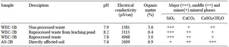In samples WEC-1B, WEC-2B, WEC-3B and AS-2B, the pH and the electrical conductivity (EC) were analyzed potentiometrically using an YSI Pro Plus multi-parameter in waste or soil suspension, prepared by mixing thoroughly solid samples with deionized water (1:1 ratio) for 10 min and let stand for 30 min. The organic matter (OM) content was determined by dichromate oxidation by the Walkley-Black method (Pansu and Gautheyrou 2006). In addition, the principal mineral phases were identified using X-ray diffraction analysis in a Rigaku D/ max 220 diffractometer (λ= 1.5406 κα Cu).