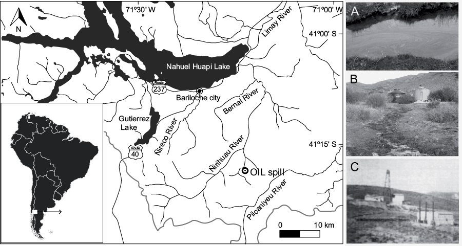 Oil exploration, exploitation, and storage are key economic activities in Patagonia, which have occasionally produced oil pollution events (SAyDS 2000, Barquín et al. 2011). The advance of these activities can endanger Patagonian aquatic ecosystems, which are very well preserved until now. However, in the early 20th century, the black gold fever had already impacted some Patagonian environments in several ways, such as the footprint of old unproductive wellbores. One of these old wellbores is located near to Bariloche city, North West Patagonia, and was under production from 1900 up to the 1940s, when it was dismantled leaving a permanent heavy oil spill (Mancini and Serna 1989). This spill runs into La Mina stream, a low order stream located in a steppe-forest transition area in the sub-Andean Mountains within the Ñirihuau river system that drains into the Nahuel Huapi Lake (Mancini and Serna 1989, Cazau et al. 2005), a glacial lake, with great touristic and conservation value (Fig. 1). Considering the public concern about adverse health effects of persistent oil pollution on highly valued aquatic ecosystems, particularly on water and edible fish, it is necessary to develop tools to assess the impact of this oil spill.