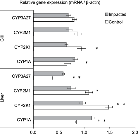 The expression levels of CYP1A mRNA were significantly higher in liver and gill (1.34 and 1.24-fold, respectively) of trout from the impacted reach relative to the control trout (from upstream of the spill). The levels of CYP2K1 mRNA were significantly lower in liver and gill (1.54 and 1.46-fold, respectively) in trout from the impacted reach relative to control. In liver, the CYP2M1 mRNA levels were lower (1.47-fold) in trout from the impacted reach relative to control; while CYP3A27 mRNA levels were higher (1.58-fold; Fig. 2).