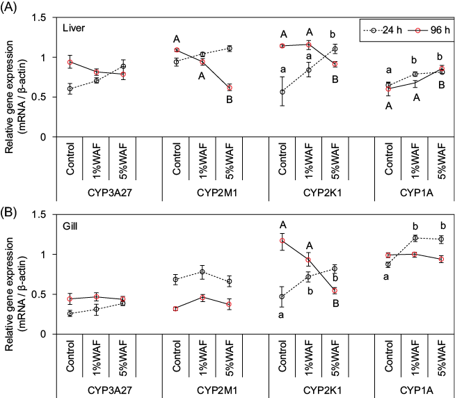 CYP1A are involved in the detoxification pathway of hydrocarbons, while CYP2K1, CYP2M1 and CYP3A27 are involved in other metabolisms. Hence, the response of the last ones to crude oil could be less specific but not less useful indicating some metabolic alterations. The transcription of CYP2s and CYP3 are affected by foreign compounds as well as by endogenous substrates (Uno et al. 2012), which implies that internal metabolism should change their mRNA levels over time, maybe explaining experimental-control differences over time. In this study, CYP2K1 was induced after 24 h exposure to WAF, as it was previously observed in reef fish (Zhu et al.2008). In contrast, more extended time and high PAH concentration (e.g. exposed trout to 5 % WAF, 96 h, and exposed wild trout) appears to down-regulate CYP2K1. More studies are needed to understand if down-regulation of liver CYP2K1 and CYP2M1 and gill CYP2K1 were caused by the disruption of physiologic homeostatic processes in which CYP2K1 and CYP2M1 enzymes participate (Zhu et al. 2008, Browne et al. 2010), or by alterations in the metabolism of estrogenic hormones (testosterone, progesterone, estradiol) and fatty acids, which could lead to the inhibition of CYP2K1 and CYP2M1 transcript expression, for example, by estradiol (Buhler et al. 2000, Sovadinová 2006). Although the results in the WAF experiment are not conclusive, differences among time response of CYP2 expression could be useful as complementary indicators of pollution by crude oil.
