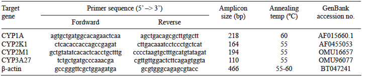 In this study we analyzed the suitability of different possible CYPs molecular biomarkers in O. mykiss for detection of oil contamination. We focused on gill and liver tissues because the gills are the primary route of hydrocarbon uptake from water, and the liver is the main organ for metabolism of toxic oil constituents (Thomas and Rice 1981). In these organs, we assessed the effects of petroleum on the transcriptional expression of CYP1A, CYP2K1, CYP2M1 and CYP3A27. Our aim was to assess the use of mRNAs levels, by semiquantitative reverse transcription polymerase chain reaction (RT-PCR), of these CYP forms in rainbow trout gill and liver. First, we explored the heavy crude oil effects on these possible biomarkers in wild juvenile rainbow trout that were caught in the La Mina stream, up and downstream of the oil spill. Second, we investigated the effects of the water-accommodated fractions (WAF) from La Mina’s oil, through laboratory experiments, on these possible biomarkers in juvenile rainbow trout.