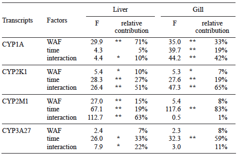 The transcript levels of CYP1A were induced by 24 h exposure to 1 % and 5 % WAF in liver and gill (1.2 and 1.4-fold, respectively), and by 96 h exposure to 5 % WAF in liver (1.4-fold), meaning that gill CYP1A levels returned to control values after 96 h. The transcript levels of CYP2K1 were induced by 24 h exposure to 5 % WAF in liver and gill (2.0 and 1.8-fold, respectively), but they were down-regulated by 96 h exposure to 5 % WAF in liver and gill (1.2 and 2.1-fold, respectively). The transcript levels of CYP2M1 declined 1.8-fold after 96 h exposure to 5 % WAF in liver, and the CYP3A27 transcript levels did not show changes after treatments (Fig. 3, Table II). Significant interactions denote different responses to WAF at 24 and 96 h (Table II). The controls of CYPs levels tended to increase over time, except gill CYP2M1 levels, being a significant source of variability (Fig. 3, Table II).
