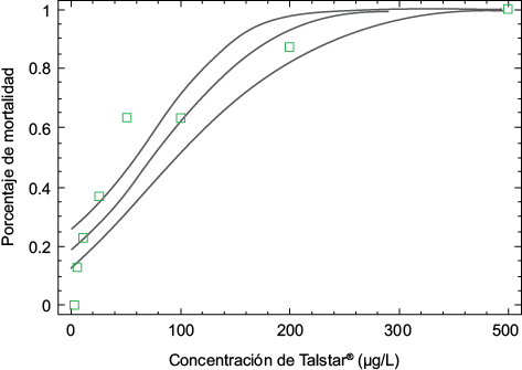 El análisis probit (p ≤ 0.01, X2 = 110.86) reveló que la CL50 de Talstar® (9 % de bifentrina, como ingrediente activo) en O. niloticus fue de 75.11 µg/L a las 96 horas. Los intervalos de confianza menor y mayor al 95 % fueron 58.76 y 96.34 µg/L, respectivamente (Fig. 1,Cuadro IV).