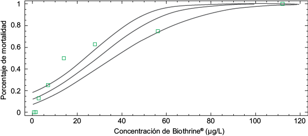 El análisis probit (p ≤ 0.01, X2 = 127.1) reveló que la CL50 de Biothrine® (2.5 % de deltametrina, como ingrediente activo) en O. niloticus fue de 28.36 µg/L a las 96 horas. Los intervalos de confianza menor y mayor al 95 % fueron 23.29 y 35.27 µg/L, respectivamente (Fig. 2, Cuadro IV).