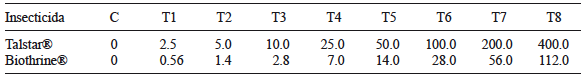 La sustancia analizada fue Talstar® con bifentrina (9 %) como principio activo y 91 % de ingredientes surfactantes y solventes. Se evaluaron ocho concentraciones (2.5 – 400 µg/L) con tres repeticiones cada una. Se utilizó un grupo testigo de agua destilada, sin insecticida (Cuadro I).