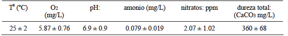 No se observó mortalidad en los peces de los grupos testigo negativo en ambos bioensayos. La temperatura y el pH de los acuarios no variaron significativamente, sólo el oxígeno disuelto presentó una disminución no significativa (p ≤ 0.05) en la mayor concentración agregada del insecticida. Los valores de la calidad del agua (media ± D.E.) se muestran en el cuadro II.