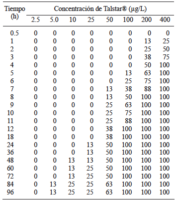 En la evaluación de Talstar®, se observó que los peces nadaban de manera errática y disfuncional a los pocos minutos de haber administrado la mezcla comercial del piretroide bifentrina adicionado con solventes y emulsificantes, especialmente en las mayores concentraciones. La mortalidad se presentó en las dosis más altas en tiempos más cortos. Por ejemplo, para la concentración de 5 µg/L la mortalidad ocurrió a partir de las 84 horas de exposición. En contraste con la concentración más alta (400 µg/L), en la que la mortalidad inició en la primer hora de exposición al piretroide (Cuadro III).