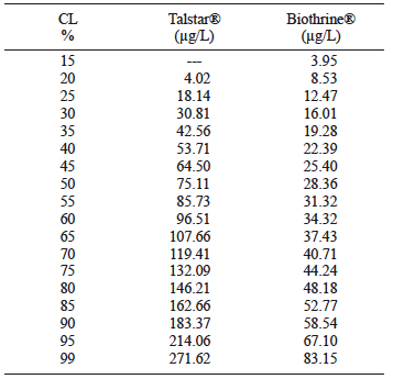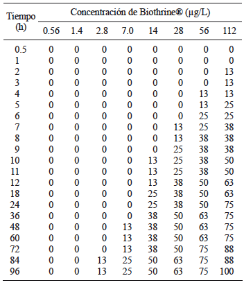 Se obtuvo a las 96 horas en ambos insecticiadas, una CL50 de 75.11 µg/L para Talstar® y de 28.36 µg/L para Biothrine®, estas formulaciones comerciales, contienen 91 y 97.5 % de ingredientes surfactantes y solventes, respectivamente.