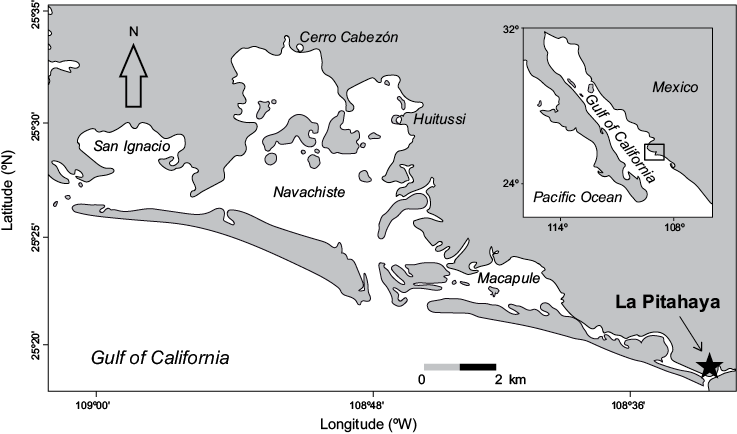 The pen shell farm is located in the estuary of La Pitahaya, in the southeastern coast of the Gulf of California (25º 21’ N, 108º 38’ W), Sinaloa, Mexico (Fig. 1). This estuary is located in the southernmost part of the SINM lagoon system, in the municipality of Guasave, which has a permanent connection with the Gulf of California through two mouths that create a marine environment most of the year. La Pitahaya is surrounded by mangrove communities. The climate of the study area is categorized as temperate-subhumid with summer rains (Hernández-Cornejo et al. 2005). Its main activity is intensive agriculture characterized by the use of irrigation and high levels of fertilizers and pesticides, whose aim is to greatly increase yield and productivity. Artisanal fishing is another important activity, and a well-developed industrial shrimp fishery is also relevant. Shrimp aquaculture has been strongly developed around the estuary, becoming so important over the last three decades that it is now in conflict with other activities (Ruiz-Luna and de la Lanza-Espino 1999) such as fisheries, since drainage from shrimp farms includes organic nutrients–especially during harvest–that flow into the lagoon system.