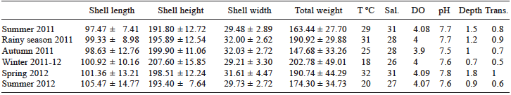 Seasonal water parameters fluctuated as follows: temperature, 18-31ºC; salinity, 26-31 PSU; dissolved oxygen, 3.9-4.1 mg/L; and pH, 7.5-7.8. The mean depth and transparency were 1.15 ± 0.50 and 0.95 ± 0.25 m, respectively. Water parameters and means of SL, SH, SW, and BW of A. maura from summer 2011 to summer 2012 are shown in table I. There were no significant differences (p > 0.05) among biometrics seasonally.