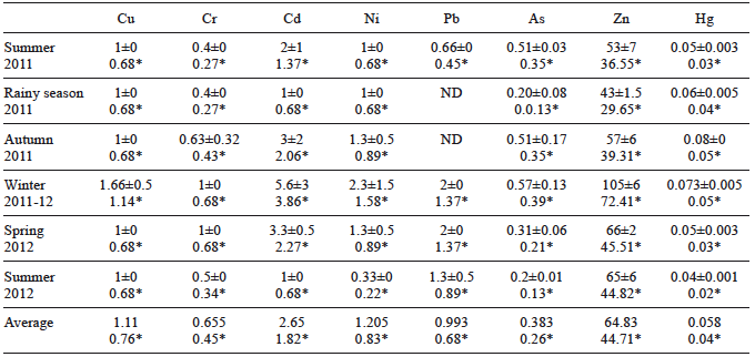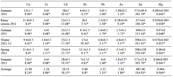 Metal concentrations in soft tissues and muscle of pen shell (µg/g, dw and ww) are given in tables II and III. For soft tissue, the higher Ni, Pb, As, Zn and Hg levels were found in winter 2011-2012. Maximum concentrations of Cr (2 µg/g, dw) and Cd (33 µg/g, dw) were obtained in spring 2012. Mean Cd (18.15 µg/g, ww) and Pb (2.31 µg/g, ww) measured in soft tissue were above permissible limits (0.5 and 1.0 µg/g, ww, respectively) established by the official mexican standards (SSA 1993) for Cd and Pb concentrations in fresh, refrigerated and frozen bivalve mollusks for human consumption. For muscle, the higher level for all metals was found in winter with the exception of Hg (0.073 µg/g, dw). Only the mean concentration of Cd surpassed the permissible level (1.82 µg/g, ww, SSA 1993).