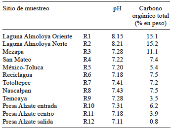 Los cuadros I y II muestran los valores de pH y la concentración del COT en los sedimentos correspondientes al lecho del río y sobre los tributarios muestreados. En el caso del pH, sólo los sedimentos de la laguna de Almoloya fueron ligeramente básicos, entre 8.15 y 8.21, mientras que para los demás sedimentos este parámetro varió entre 7.11 y 7.43. La concentración de COT, en el sedimento del lecho del río varió entre 0.8 % y 16.2 % y en los tributarios entre 2.65 % y 10.6 % (Cuadros I y II). Los sedimentos con mayor concentración promedio fueron Almoloya (R1 y R2) y Mezapa (R3 y D2), en tanto que los de menor concentración promedio fueron los de la presa Alzate a su salida y los correspondientes a los ríos Xonacatlán, Santa Catarina, San Lorenzo, Tejalpa y Temoaya.