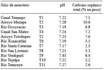 A cada muestra de sedimento se le determinó el pH con un potenciómetro marca “Hach” (SCOFI 1984) y el contenido de carbono orgánico total (COT) con un analizador elemental “OI Analytical”. Se seleccionaron estos parámetros ya que pueden influir en la toxicidad y movilidad de los contaminantes (Coz et al. 2008, Karlsson et al. 2010).