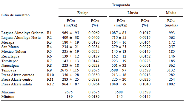 Los resultados del análisis de varianza de la EC50 en los sedimentos riverinos, muestran que en general las muestras tomadas de los sitios de Temoaya, Presa Alzate (salida) y Almoloya (norte y oriente) son estadísticamente diferentes al resto de los sedimentos (α ≤ 0.05), lo cual puede deberse a que los sitios en la parte intermedia del CARL tienen una fuerte influencia de descargas tanto de origen municipal como industrial. Por otro lado, la laguna de Almoloya recibe un aporte importante de aguas municipales no tratadas de las poblaciones aledañas, presenta una pendiente de sur a norte y una barrera física que impide que el agua fluya hacia lo que es el inicio del río Lerma, por lo que probablemente muchos de los contaminantes se están depositando en esta zona y así, provocan la alteración de la calidad de los sedimentos (Tejeda et al. 2005, 2006, Zarazúa et al. 2011). El resultado de este estudio clasifica a los sedimentos de esta laguna como extremadamente tóxicos, con un pH ligeramente básico, lo cual se puede deber a la naturaleza calcoalcalina de la zona, constituida principalmente por materiales piroclásticos y rocas basálticas (GEM 1993, Díaz et al. 2005). La concentración promedio de COT fue de 15 %, con lo que se rebasó el límite máximo recomendado (10 %) por el Ministerio de Ambiente y Energía de Ontario para la protección de la vida acuática (MEEO 1993). Además, se presentan altas concentraciones de compuestos orgánicos, metales, materia orgánica, nutrientes y un abatimiento de los niveles de oxígeno disuelto (Hinojosa 2006, Carreño 2008, Zarazúa 2008).