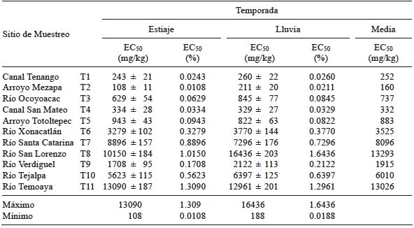Respecto a la temporalidad, no se observaron diferencias significativas en la toxicidad de los sedimentos entre la época de estiaje y la de lluvia para los sedimentos del río ni para los de los tributarios (α > 0.05). Este resultado concuerda con lo reportado por Tejeda et al. (2006) que indican que no hay diferencia significatitiva temporal en la concentración de metales en el sedimento depositado del CARL, lo cual se debe principalmente al método de muestreo aplicado que no permite la separación de estratos.