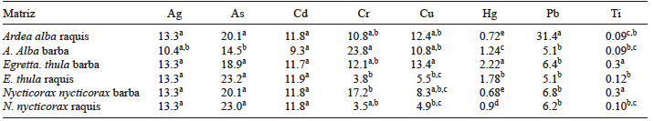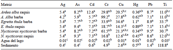 Las concentraciones de metales en plumas de aves acuáticas variaron de acuerdo con el siguiente patrón: raquis de A. alba: Cr > Pb> Cu > Ti > As > Cd > Ag > Hg; barba de A. alba y E. thula: Cr > Cu > Ti > Pb > As > Cd > Ag > Hg; raquis de E. thula y barba de N. nycticorax: Cr > Ti > Cu > Pb > As > Cd > Ag > Hg; raquis de N. nycticorax: Cr > Cu > Ti > As > Pb > Cd > Ag > Hg. Lo anterior indica que cada especie concentra los metales en diferente orden, sin embargo, se aprecia que el Cr es el metal que mayormente se concentra y que Ag y Hg son los que se encuentra en menor concentración.