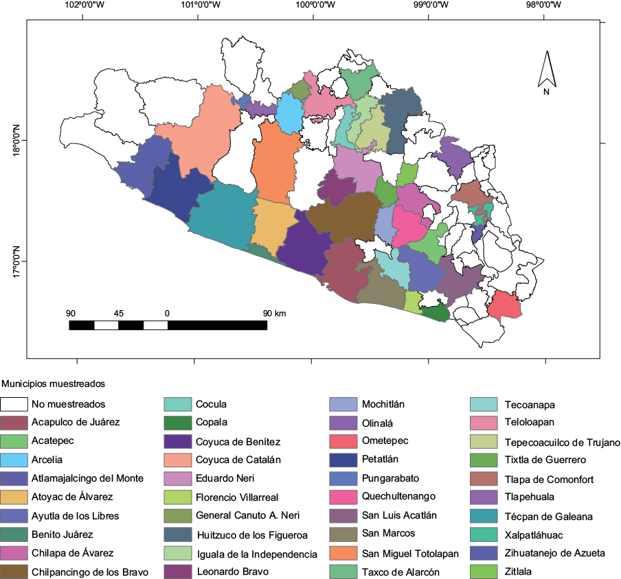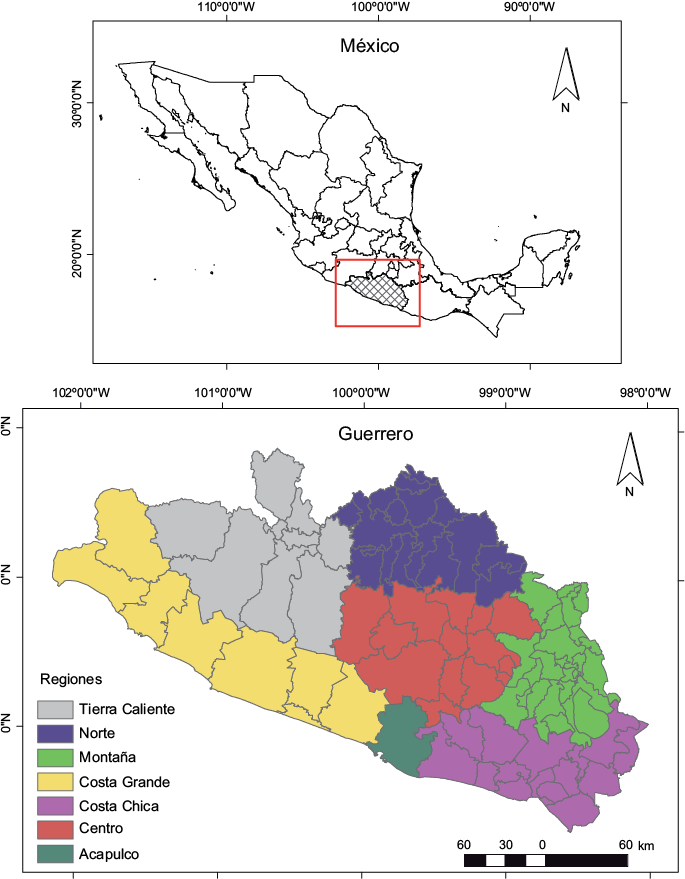 El estado de Guerrero se localiza al sur de México entre las coordenadas 16º 18’-18º 48 de latitud norte y 98º 03’-102º 12’ de longitud oeste. Posee un clima cálido subhúmedo en la mayor parte de su territorio, la precipitación anual promedio es de 1200 mm. Cuenta con 81 municipios y está dividido en siete regiones político administrativas, a saber: Tierra Caliente, Norte, Centro, Montaña, Costa Grande, Costa Chica y Acapulco (Fig. 1). De acuerdo con el Censo de Población y Vivienda de 2010 llevado a cabo por el Instituto Nacional de Estadística y Geografía de México (INEGI), su población consta de 3388 738 hab, con 1743207 mujeres y 1645 561 hombres (INEGI 2010).