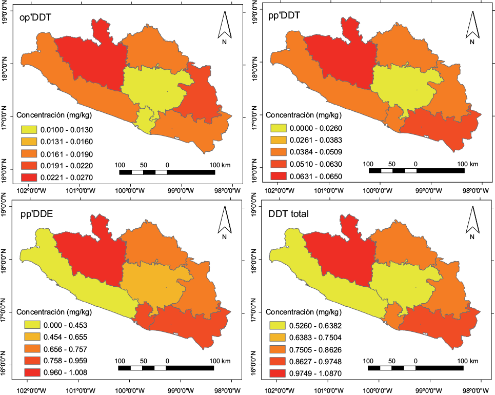 Se observó una presencia diferenciada de estos contaminantes en las regiones que conforman el estado de Guerrero, ya que los compuestos derivados del DDT presentaron mayores concentraciones en la Tierra Caliente y la Costa Chica, en tanto que las regiones Norte y Costa Grande exhibieron concentraciones superiores de HCB y β-HCH, respectivamente. También se detectó mayor exposición en las mujeres procedentes de localidades rurales, puesto que tuvieron niveles más altos de plaguicidas respecto a las que habitan en el medio urbano. Esto tiene implicaciones importantes, ya que el territorio guerrerense posee un fuerte componente rural; por lo tanto, un segmento importante de la población se encuentra expuesto a estos contaminantes.