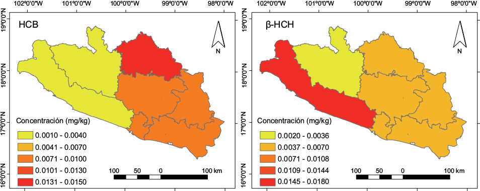 Por su parte, las concentraciones más bajas de HCB se registraron en la Costa Grande (0.001 mg/kg) y Tierra Caliente (0.002 mg/kg), mientras que la más alta se observó en la región Norte con 0.015 mg/kg. El rango de valores β-HCH abarcó desde 0.002 mg/kg (Tierra Caliente) hasta 0.018 mg/kg en la Costa Grande. En ambos casos, las diferencias en las concentraciones de HCB y β-HCH entre regiones no fueron estadísticamente significativas (p > 0.05) (Cuadro II y Fig. 4).