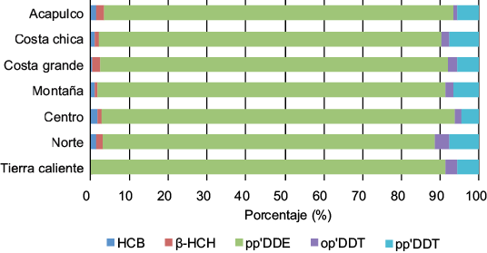 La suma de las medianas de los plaguicidas muestra que las regiones menos contaminadas del estado fueron la Costa Grande y Centro, con 0.533 y 0.591 mg/kg, respectivamente, mientras que las regiones con mayor carga de estos contaminantes fueron Tierra Caliente (1.102 mg/kg) y Costa Chica (0.975 mg/kg) (Cuadro II). Las proporciones relativas de cada plaguicida en las regiones fueron variables, pero existieron algunos datos que deben resaltarse, como el caso de la región Tierra Caliente que tuvo porcentajes bajos de HCB y β-HCH; por el contrario, el pp’DDE fue el compuesto que predominó entre las habitantes de esta región. También, en el caso de la Costa Chica, el pp’DDT fue el segundo compuesto de importancia con casi un 8 % del total (Fig. 5).