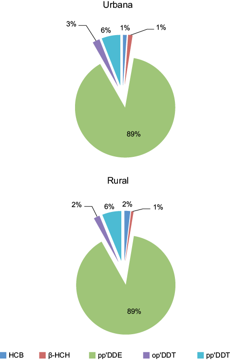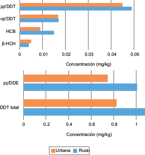 Estos resultados son consistentes con los reportados por Waliszewski et al. (1996), que encontraron en leche de madres de zonas suburbanas de Veracruz, México, concentraciones mayores de Ʃ-HCH (0.806 mg/kg), pp’DDE (8.253 mg/kg) y pp’DDT (2.460 mg/kg) que en las de zonas urbanas (Ʃ-HCH = 0.387, pp’DDE = 2.709 y pp’DDT = 0.422 mg/kg). En un estudio realizado por Prado et al. (2004) en la Ciudad de México, se obtuvieron valores similares de γ-HCH en zonas rurales (0.300 mg/kg) y en zonas urbanas (0.260 mg/kg). En Bélgica, Colles et al. (2008) analizaron muestras de leche de habitantes con un considerable componente rural (Valonia) y localidades netamente urbanas como Flandes y Bruselas. La primera región presentó niveles de HCB = 0.017 mg/kg y pp’DDE = 0.085 mg/kg, mientras que en Flandes el HCB fue de 0.016 mg/kg y el pp’DDE de 0.118 mg/kg. En Bruselas se encontraron concentraciones parecidas (HCB = 0.017 y pp’DDE = 0.090 mg/kg). Por último, en Túnez las concentraciones de DDT total de mujeres de zonas rurales tuvieron valores superiores (0.059 mg/kg) en comparación con las que habitan en zonas urbanas (0.018 mg/kg) (Ennaceur et al. 2008).