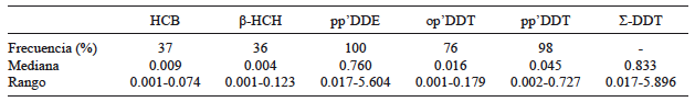 Se detectaron los isómeros pp’ y op’ DDT y su metabolito pp’DDE. El pp’DDT fue el que mayor concentración presentó respecto al op’DDT (Cuadro I). Esto se debe probablemente a que la formulación del plaguicida DDT que fue utilizado para el control del mosquito transmisor del paludismo estaba constituido en mayor proporción por el pp’DDT (85 %), en tanto que el op’DDT se encontraba en cantidades de 15 % o menos. Los compuestos α- y γ-HCH no se detectaron en ninguna muestra. De acuerdo con otros estudios, estos isómeros son poco persistentes debido a que su degradación es más rápida tanto en el ambiente como en los sistemas biológicos (Bachmann et al. 1988).