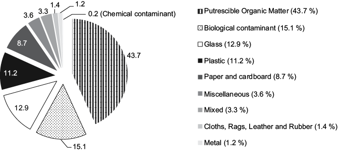 Putrescible organic matter made up the highest proportion of total waste with 43.7%, which is followed by the biological contaminants category with 15.1 % and by glass, plastic, paper, and cardboard with 12.9 %, 11.2 %, and 8.7 %, respectively. The percentage of all categories of waste is shown in figure 1.