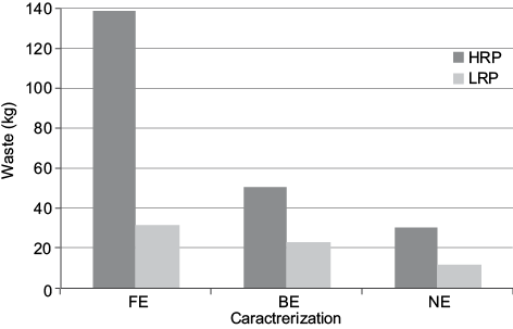 Table VII shows that the increase in waste generation of FE is due to the increment in the generation of waste with HRP (p < 0.05) and not of waste with LRP, which did not show a significant difference between the characterizations. This difference is attributed to the activities and food/beverage consumption that occurs in the ballroom and it is reflected in the per capita contribution of waste with HRP.