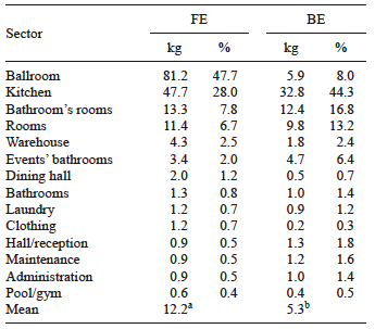 The kitchen is among the sectors that generated the greatest quantity of waste, since it is responsible for the preparation of most of the meals served in the lodging. The ballroom, kitchen, room’s bathrooms, and rooms contributed with more than 80 % of the total amount of waste in the lodging. It was observed that in FE, the waste generation in the ballroom contributed to 48 % of the total waste, while in BE this value was 8 %.
