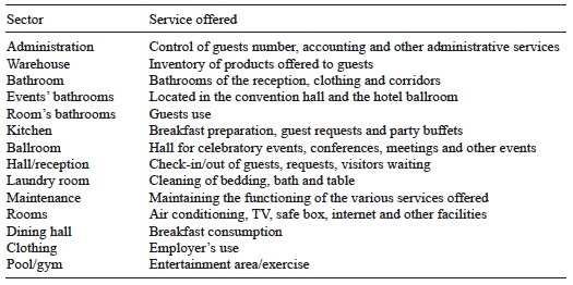 The investigation was conducted in southern Brazil (31º46’19’’S; 52º20’33’’W) in a medium-sized lodging site with 74 housing units (6800 m2 approximately). The services provided are: living rooms, breakfast, garage, laundry, maintenance, messengers, office, swimming pool, rooms adapted for people with special needs, reservations, gym room, convention rooms, ballroom, and steam room.