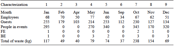 The wastes collected for evaluation were generated for three days, i.e., the time the wastes were stored until the collection by the municipal public service. Monthly characterizations were performed for nine months and the following parameters were evaluated: number of employees, number of guests, number of people in events, types of festive events (birthdays and graduations) and types of business events (divulgation of commercial products, business meetings, and conferences). Three characterizations were also evaluated without event occurrence for control effect.