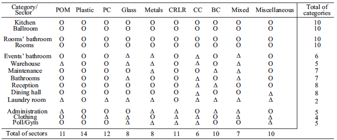 The waste categories generated in each sector can be seen in table IV. In the kitchen, ballroom, rooms, and room’s bathrooms sectors all types of waste were generated. In other sectors, the generation of at least four categories of waste can occur except in laundry, where only the generation of plastic and CRLR were identified.