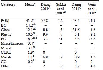 The categories of miscellaneous, mixed, CRLR and metal wastes differ from other studies shown in Table V, except for the study of Dangi et al. (2011), who found that in a restaurant the consumption of beverage in glass bottles is common.