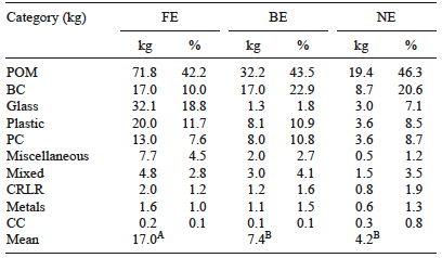 The per capita generation of waste for FE, BE and NE was 0.359, 0.145 and 0.320 kg/person/day, respectively.
