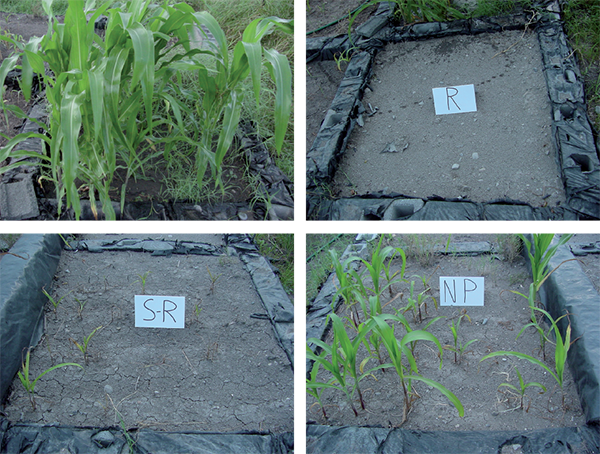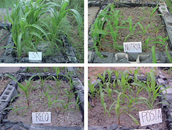 Respecto a la supervivencia y crecimiento del cultivo, después de más de un año de biorremediación de los recortes contaminados con hidrocarburos, tiempo en que la CE en todas las celdas se mantuvo en valores tolerables para el cultivo (Richards 1980), las plantas de maíz sobrevivieron (Fig. 6) y crecieron considerablemente en la mezcla de recortes y suelo adicionada con N y P (85 cm), aunque no con el mismo vigor que las plantas sembradas en suelo libre de hidrocarburos (testigo), donde se registró una altura de 155 cm.