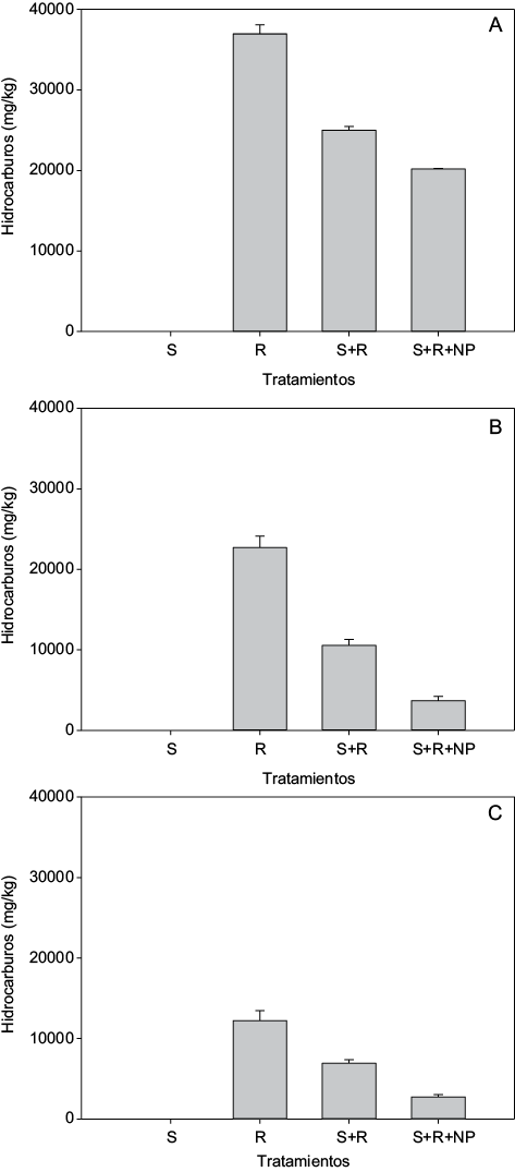 Estos resultados indican que los tres suelos estudiados contienen los microoganismos necesarios para llevar a cabo la descomposición de los hidrocarburos contenidos en las recortes de perforación y que los tres suelos pueden utilizarse para inducir la biorremediación de recortes contaminados con hidrocarburos, siempre y cuando se realice la bioestimulación de los microorganismos del suelo manteniendo condiciones satisfactorias de humedad, aireación y disponibilidad de nutrientes N y P. Lo anterior indica, además, de acuerdo con Niemi et al. (1987) que todos los suelos del centro y norte del estado de Tamaulipas pueden dar buenos resultados en la biorremediación de recortes de perforación contaminados con hidrocarburos.