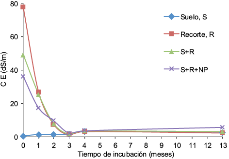 Como se mencionó en la descripción de los recortes de perforación (Cuadro II), una de las características principales de estos materiales del subsuelo es su alto contenido de sales, mayormente de Ca y Mg, ya que se encontró en ellos una conductividad eléctrica (CE) de más de 77 dS/m medida en extracto de saturación. Esta elevada conductividad eléctrica se observó también en las mezclas de suelo y recortes al inicio del periodo de incubación, en las que se observaron valores de 36 y 40 dS/m, respectivamente (Fig. 3). Después de tres meses de que los recortes y las mezclas se colocaron en las celdas, el nivel de CE descendió en todas las mezclas hasta niveles tolerables para los cultivos comunes (Richards 1980) y por lo tanto por los microrganismos del suelo: menos de 4 dS/m.