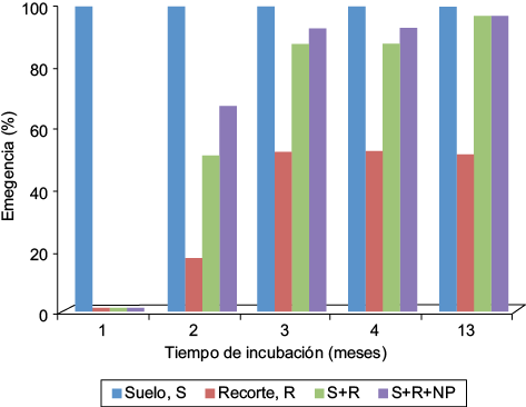 La figura 5 muestra los porcentajes de emergencia de plántulas de maíz sembradas en los recortes de perforación y en sus mezclas con suelo agrícola. Como se puede observar, las plántulas de maíz no emergieron en el recorte contaminado ni en las mezclas de recortes y suelo agrícola después del primer mes de incubación debido a la elevada concentración de hidrocarburos (Rivera-Cruz y Trujillo-Narcia 2004) y sales solubles (Figs. 2 y 3). Al término de los dos primeros meses de incubación se observó emergencia, pero en porcentajes muy bajos: menos de 20 % en las celdas con recortes contaminados, 50 % en las celdas con mezcla de recortes y suelo, y más de 60 % en la misma mezcla pero adicionada con N y P. Después de tres meses de incubación, tiempo en que la CE había disminuido a menos de 2.1 dS/m en todas las celdas debido a la abundante precipitación (Fig. 4) y lixiviación de sales solubles, la emergencia continuó al 50 % en el recorte de perforación y al 80 % en las mezclas de recorte y suelo agrícola. Esta tendencia indica que después del tercer mes de incubación, la concentración de sales solubles en las mezclas (y quizás el contenido de hidrocarburos) había disminuido a niveles lo suficientemente bajos para permitir la emergencia de las plántulas de maíz (Richards 1980).