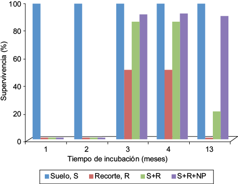 Una vez colocadas dentro de las celdas, las mezclas se mantuvieron a un nivel mínimo de humedad equivalente al 50 % de la capacidad de campo por un periodo de 13 meses y se removieron una vez por mes dentro de la celda a fin de favorecer la aireación y por lo tanto la descomposición de los HC. Se midió la concentración de HC de fracción pesada de las mezclas (USEPA 1998) al inicio del periodo de incubación y después de seis y 12 meses, para lo cual se tomaron de manera aleatoria tres muestras de un kilogramo de suelo de cada celda y de la capa superficial de 10 cm. Utilizando el mismo tipo de muestreo se midió también la conductividad eléctrica en extracto de saturación (Richards 1980). Se utilizó un diseño completamente aleatorio con cuatro tratamientos (suelo, recorte, suelo-recorte y suelo-recorte enriquecidos con N y P) y tres repeticiones. El análisis estadístico consistió en análisis de varianza y prueba de Tukey.
