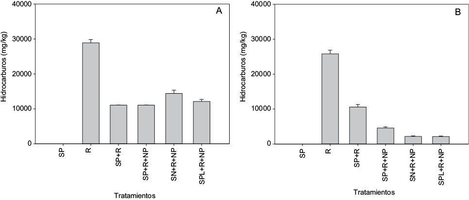 La disminución de los hidrocarburos hasta niveles cercanos a los aceptables, debido al proceso de biorremediación de los recortes, ocurrió durante los primeros seis meses en las mezclas adicionadas con los nutrientes N y P. En las mezclas donde no se adicionaron los nutrientes, ese nivel no se alcanzó a pesar de haber permanecido en incubación por un periodo de 12 meses. Debido a que en la segunda mitad del periodo anual de incubación la tasa de descomposición de hidrocarburos fue muy baja en comparación con los primeros seis meses, se puede decir que la biorremediación de recortes de perforación contaminados con hidrocarburos se puede lograr en un periodo ligeramente mayor al medio año si se aplican condiciones adecuadas de humedad, aireación y disponibilidad de N y P.