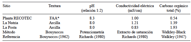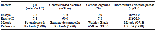 Las características de los suelos que se utilizaron en mezcla con los recortes para inducir la biorremediación de estos residuos contaminados con HC se presentan en el cuadro I. Como se puede observar, los suelos tenían una textura franco-arcillo-arenosa en el sitio de la planta RECOTEC y arcillosa en los sitios de Nutria y Posta. Asimismo, presentaban un pH medianamente alcalino, bajo contenido de carbono orgánico y concentración baja de sales solubles. Ninguno de los suelos presentaba contaminación con HC. Por el contrario, los recortes de perforación mostraban contenidos elevados de HC totales así como un alto nivel de sales solubles y un pH medianamente alcalino (Cuadro II).