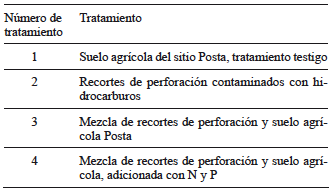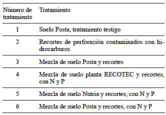 Con la finalidad de comparar tres tipos de suelo con relación a su capacidad para inducir la descomposición de HC en los recortes de perforación, se llevó a cabo un segundo experimento en celdas de iguales dimensiones (1.0 × 1.2 × 0.4 m) con mezclas conformadas por recortes de perforación y suelo de cada uno de los sitios estudiados. En el cuadro IV se presentan los tratamientos estudiados en este ensayo. Se colocó suelo agrícola de la capa superficial (0-20 cm) del sitio Posta en una celda para representar el tratamiento testigo. Una segunda celda se llenó con recortes contaminados. Mezclas (1:1.5) de suelo de cada uno de los tres sitios indicados y recortes contaminados se colocaron también en celdas con la adición de N y P. Se colocó el suelo de cada sitio en la celda hasta llegar a 40 % del volumen total. Después se rellenó el resto del volumen de las tres celdas con recortes de perforación. Estos materiales se dejaron en reposo sin humedecerse durante 15 días, al término de los cuales se mezcló y homogeneizó el contenido de cada celda.