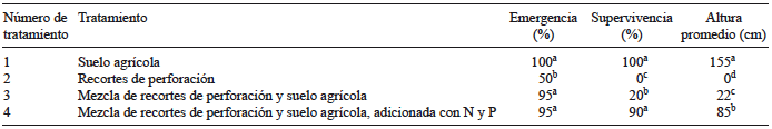 En este ensayo también se evaluó la respuesta del cultivo de maíz (Zea mays) variedad criollo regional, establecido en las celdas al término del sexto mes de incubación de las mezclas, a fin de determinar por medio de su altura si la biorremediación se llevó a cabo en los recortes y saber si la concentración de HC en los recortes disminuyó hasta niveles tolerables por las plantas. Para conocer el efecto de los HC en la germinación se sembraron semillas 100 % viables de maíz al término del sexto mes, en una población de 40 plantas por celda, distribuidas en cuatro hileras. Se midió el porcentaje de germinación del maíz, el porcentaje de supervivencia de los germinados y el crecimiento de las plantas en centímetros. El análisis de varianza y la prueba de comparación de medias se realizaron a través de la estadística Ji cuadrada (X2) para los porcentajes de germinación y supervivencia.