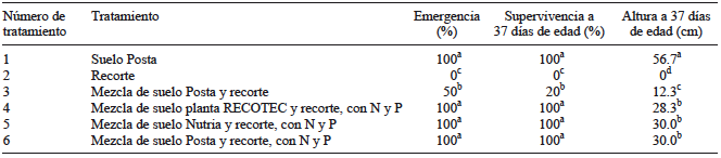 Además de las variables descritas se midieron los porcentajes de germinación y supervivencia, así como la altura de plantas de maíz (Zea mays) para evaluar la respuesta del cultivo establecido en las celdas (40 plantas por celda, alineadas en cuatro hileras). Esto se hizo al término del primero, segundo, tercero, cuarto y decimotercero meses de incubación de las mezclas a fin de comprobar la disminución de la concentración de HC en los recortes hasta niveles tolerables por las plantas.