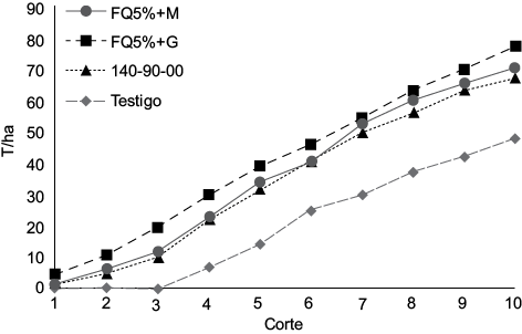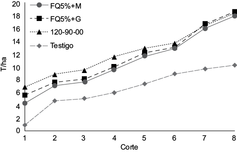 Una respuesta similar se observó en el pepino. Los resultados de 10 cortes demostraron que los mayores rendimientos de fruto se registraron con gallinaza más la mitad de la fertilización química (77.2 t/ha), seguidos de forma semejante por la inoculación de R. intraradices y la fertilización al 100 %, tratamientos que promediaron 68.8 t/ha y fueron estadísticamente semejantes (Fig. 2; Cuadro II). En un estudio con pepino producido en condiciones de casa malla, Meneses et al. (2014) reportaron rendimientos similares entre la fertilización tradicional (165-60-90) comparada con la aplicación de 5 t/ha de lombricomposta, inoculación de R. intraradices y el 50 % del fertilizante, que en promedio fueron de 77.0 t/ha.